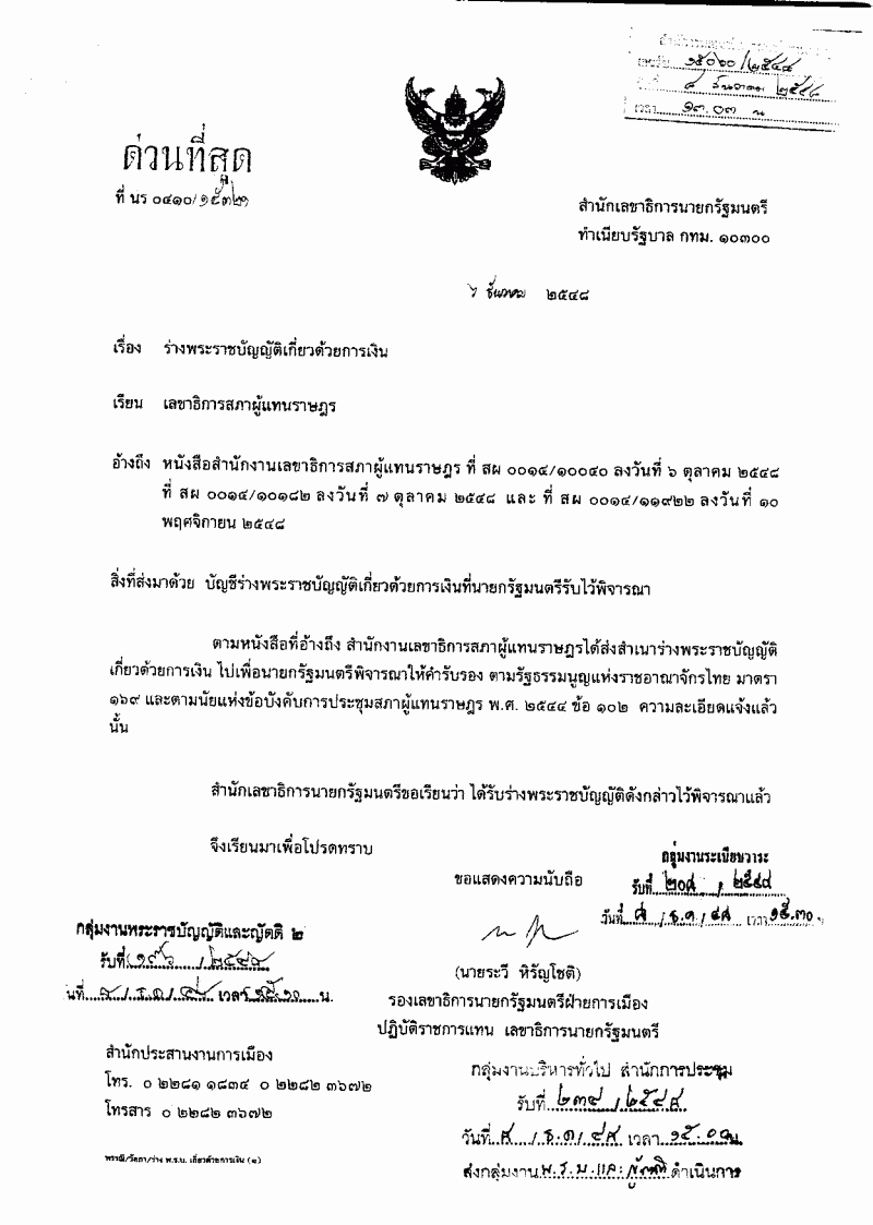 รับทราบเรื่องนายกรัฐมนตรีได้รับร่างพระราชบัญญัติเกี่ยวด้วยการเงินฯ จำนวน 6 ฉบับ |