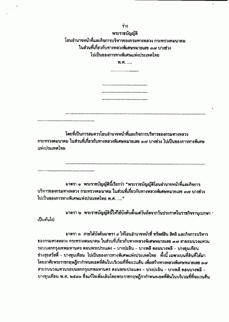 • ร่างพระราชบัญญัติโอนอำนาจหน้าที่และกิจการบริหารของกรมทางหลวง กระทรวงคมนาคมในส่วนที่เกี่ยวข้องกับทางหลวงพิเศษหมายเลข 37