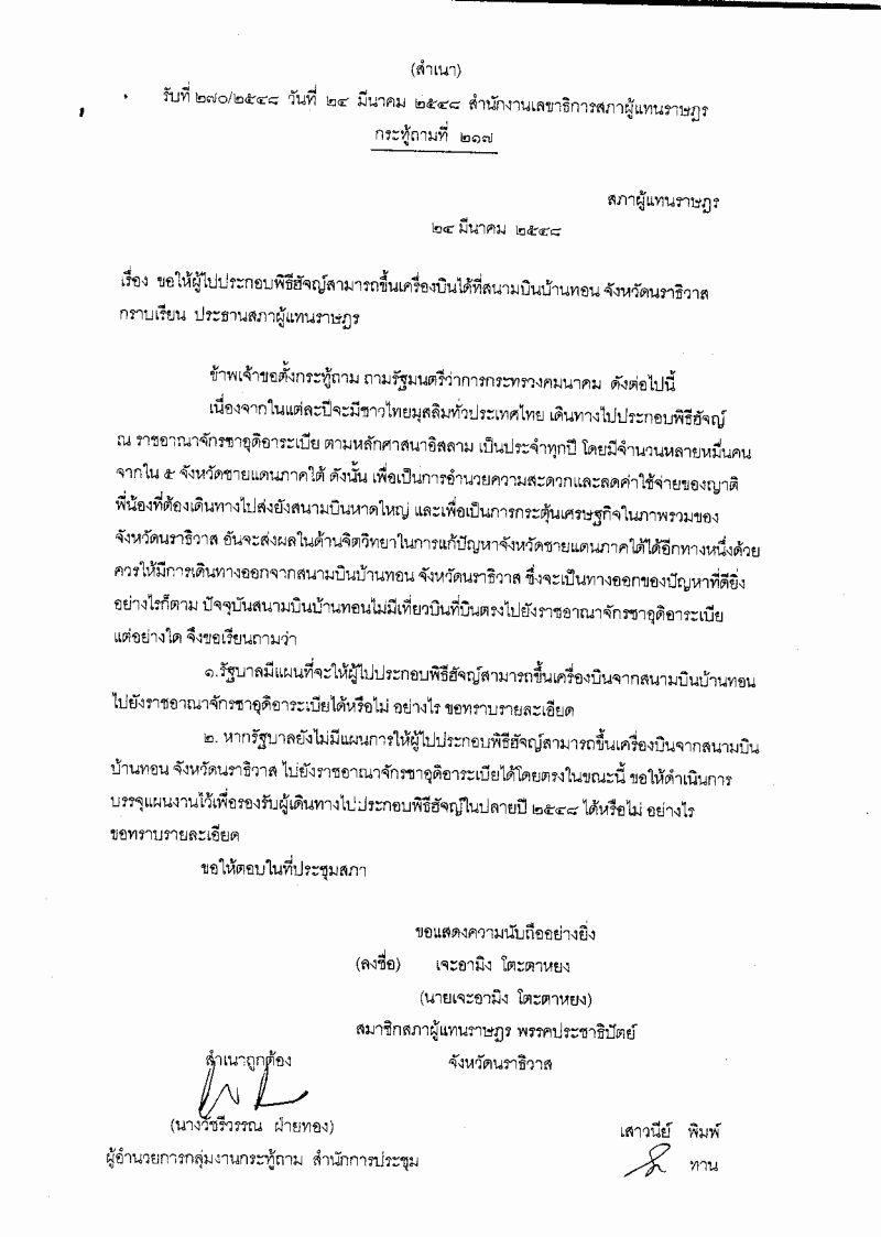 กระทู้ถามที่ ๒๑๗ เรื่อง ขอให้ผู้ไปประกอบพิธีฮัจญ์สามารถขึ้นเครื่องบินได้ที่สนามบิน |