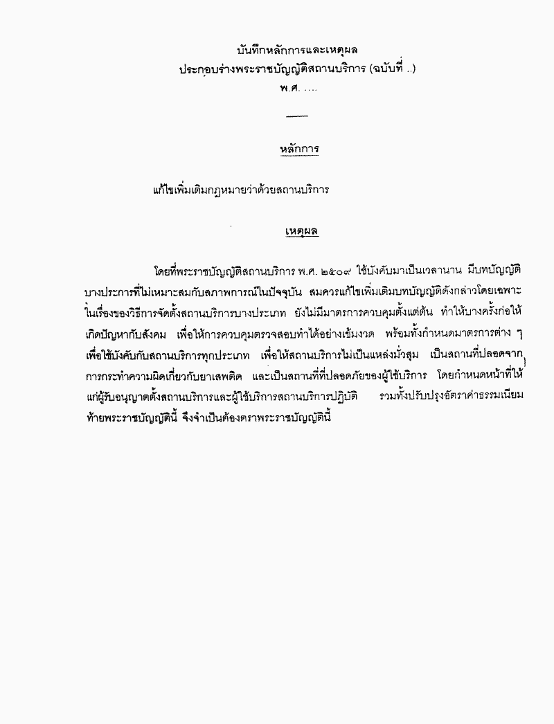 ชื่อเอกสาร :   ร่างพระราชบัญญัติสถานบริการ (ฉบับที่ ..) พ.ศ. .... (พลตำรวจโท วิโรจน์ เปาอินทร์ และนายชูวงศ์ ฉายะบุตร เป็นผู้เสนอ)