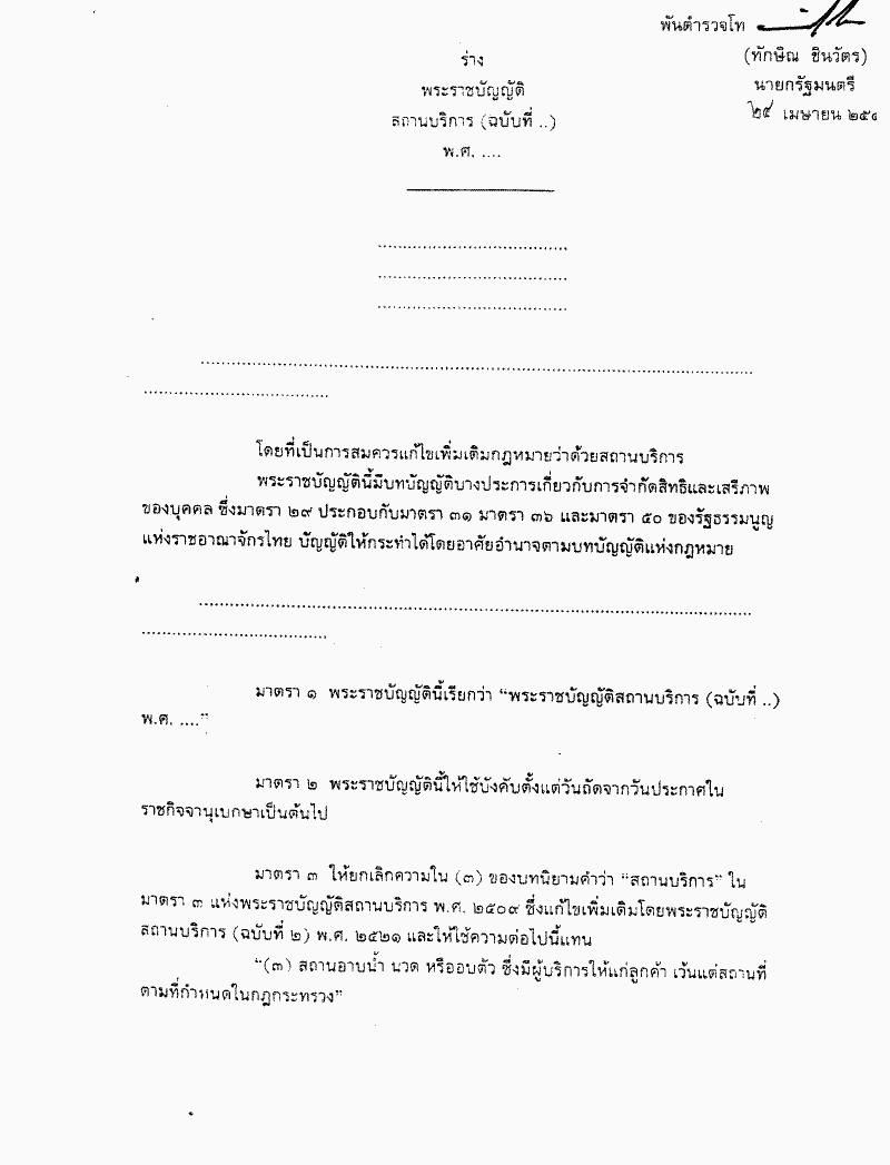 ชื่อเอกสาร :   ร่างพระราชบัญญัติสถานบริการ (ฉบับที่ ..) พ.ศ. .... (นายอำนวย คลังผา เป็นผู้เสนอ)