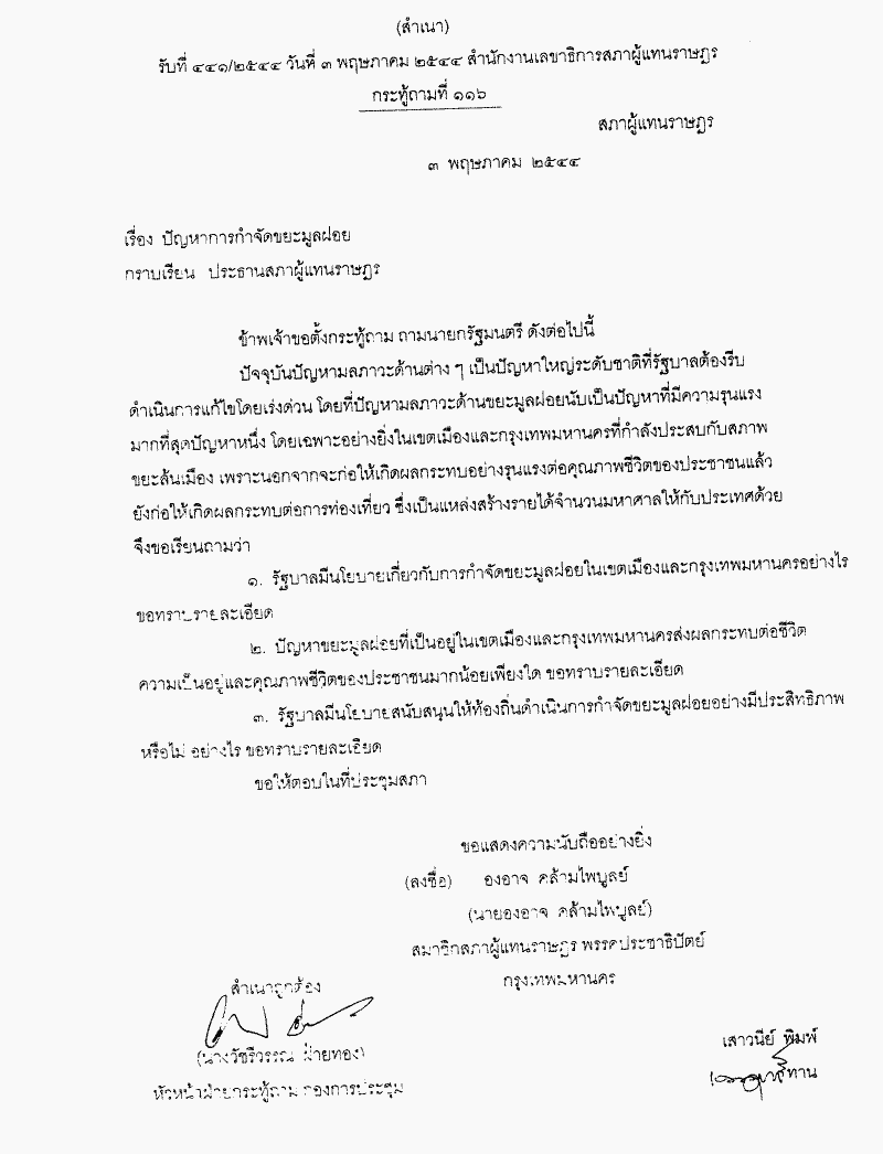 ชื่อเอกสาร : กระทู้ถามที่ 116 เรื่อง ปัญหาการกำจัดขยะมูลฝอย นายองอาจ คล้ามไพบูลย์ เป็นผู้ตั้งกระทู้ถาม ถามนายกรัฐมนตรี