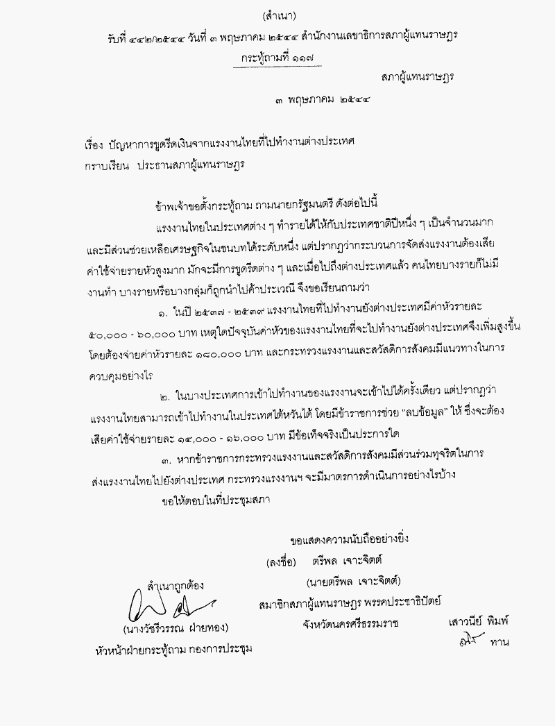 กระทู้ถามที่ 117 เรื่อง ปัญหาการขูดรีดเงินจากแรงงานไทยที่ไปทำงานต่างประเทศ นายตรีพล เจาะจิตต์ เป็นผู้ตั้งกระทู้ถาม ถามนายกรัฐมนตรี |