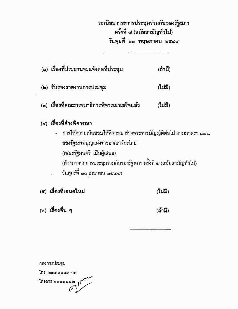 ระเบียบวาระการประชุมร่วมกันของรัฐสภา ครั้งที่ ๗ (สมัยสามัญทั่วไป) วันพุธที่ ๒๓ พฤษภาคม ๒๕๔๔ |