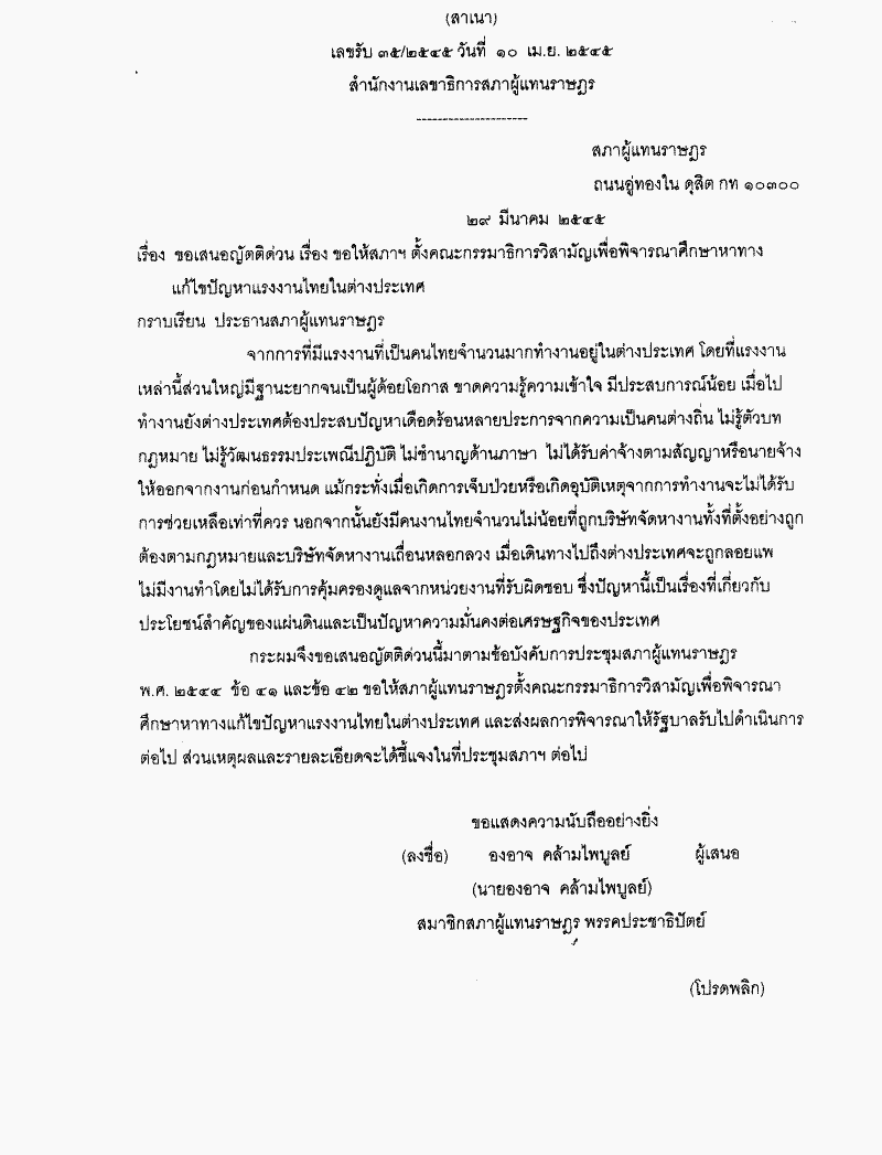 ขอเสนอญัตติด่วน เรื่อง ขอให้สภาฯ ตั้งคณะกรรมาธิการวิสามัญเพื่อพิจารณาศึกษาหาทางแก้ไขปัญหาแรงงานไทยในต่างประเทศ |