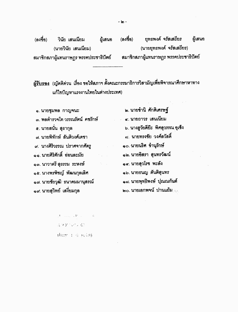 • ขอเสนอญัตติด่วน เรื่อง ขอให้สภาฯ ตั้งคณะกรรมาธิการวิสามัญเพื่อพิจารณาศึกษาหาทางแก้ไขปัญหาแรงงานไทยในต่างประเทศ