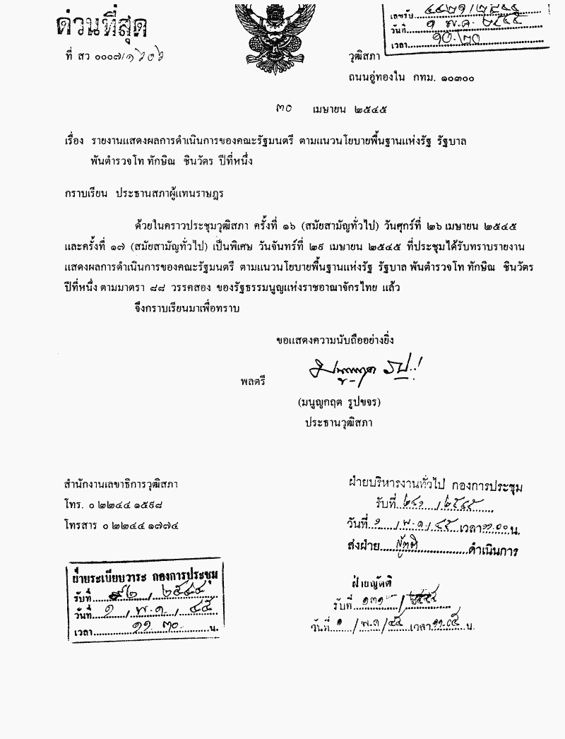 รายงานแสดงผลการดำเนินการของคณะรัฐมนตรี ตามแนวนโยบายพื้นฐานแห่งรัฐ รัฐบาลพันตำรวจโท ทักษิณ ชินวัตร ปีที่หนึ่ง |