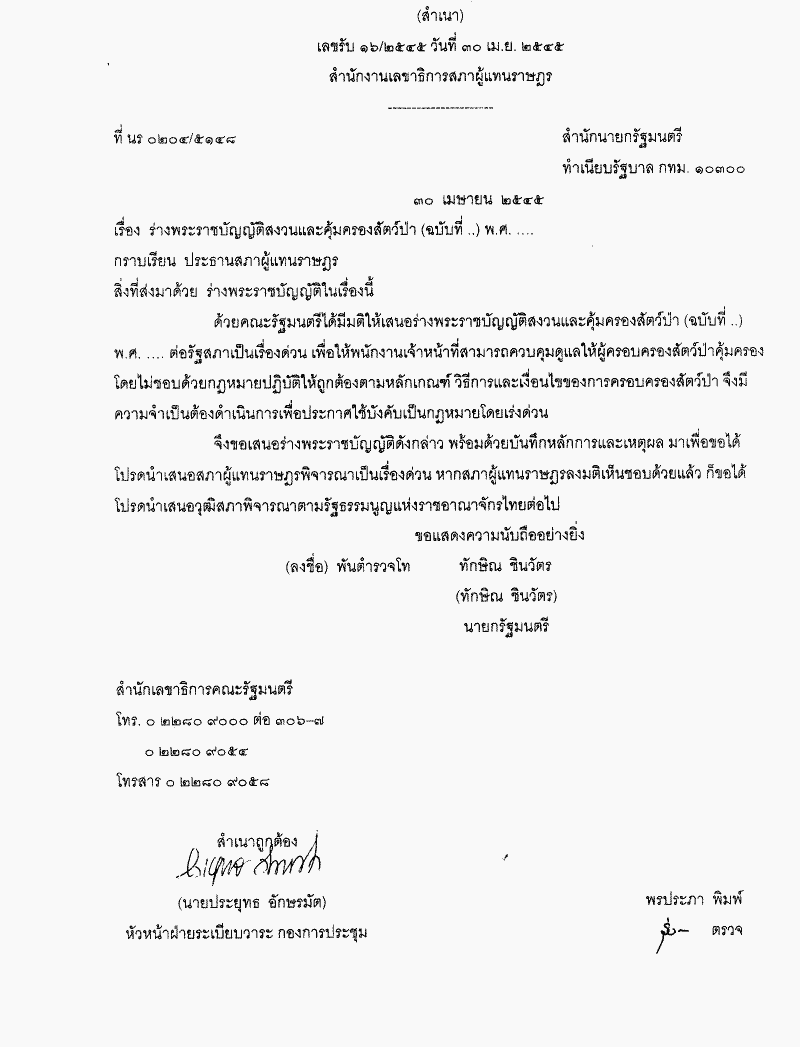• ร่างพระราชบัญญัติสงวนและคุ้มครองสัตวป่า (ฉบับที่ ..) พ.ศ. .... (คณะรัฐมนตรี เป็นผู้เสนอ)