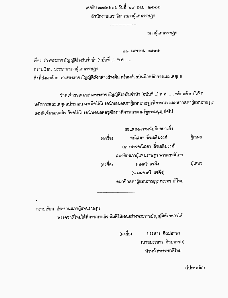 • ร่างพระราชบัญญัติโรงรับจำนำ (ฉบับที่ ..) พ.ศ. .... (นางสาวจนิสตา ลิ่วเฉลิมวงศ์ และนางผ่องศรี แซ่จึง เป็นผู้เสนอ)