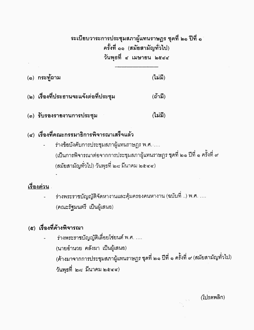 ระเบียบวาระการประชุมสภาผู้แทนราษฎร ชุดที่ ๒๑ ปีที่ ๑ ครั้งที่ ๑๑ (สมัยสามัญทั่วไป) วันพุธที่ ๔ เมษายน ๒๕๔๔ |