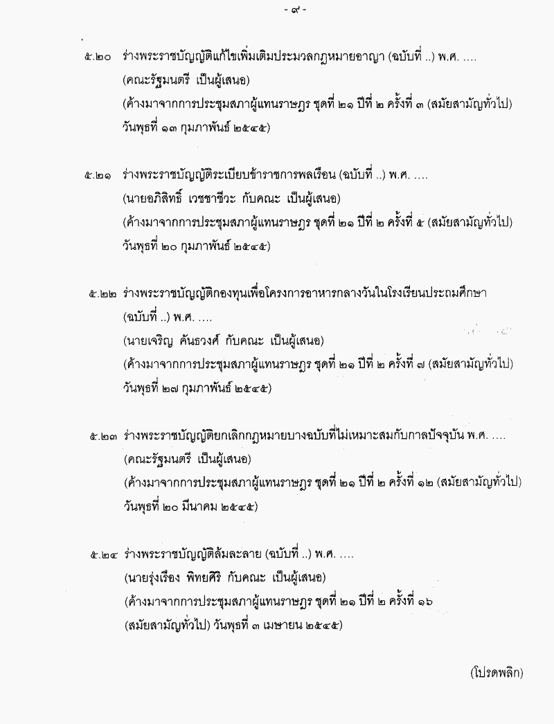 • ระเบียบวาระการประชุมสภาผู้แทนราษฎร ชุดที่ 21 ปีที่ 2 ครั้งที่ 23 (สมัยสามัญทั่วไป) วันพุธที่ 8 พฤษภาคม 2545