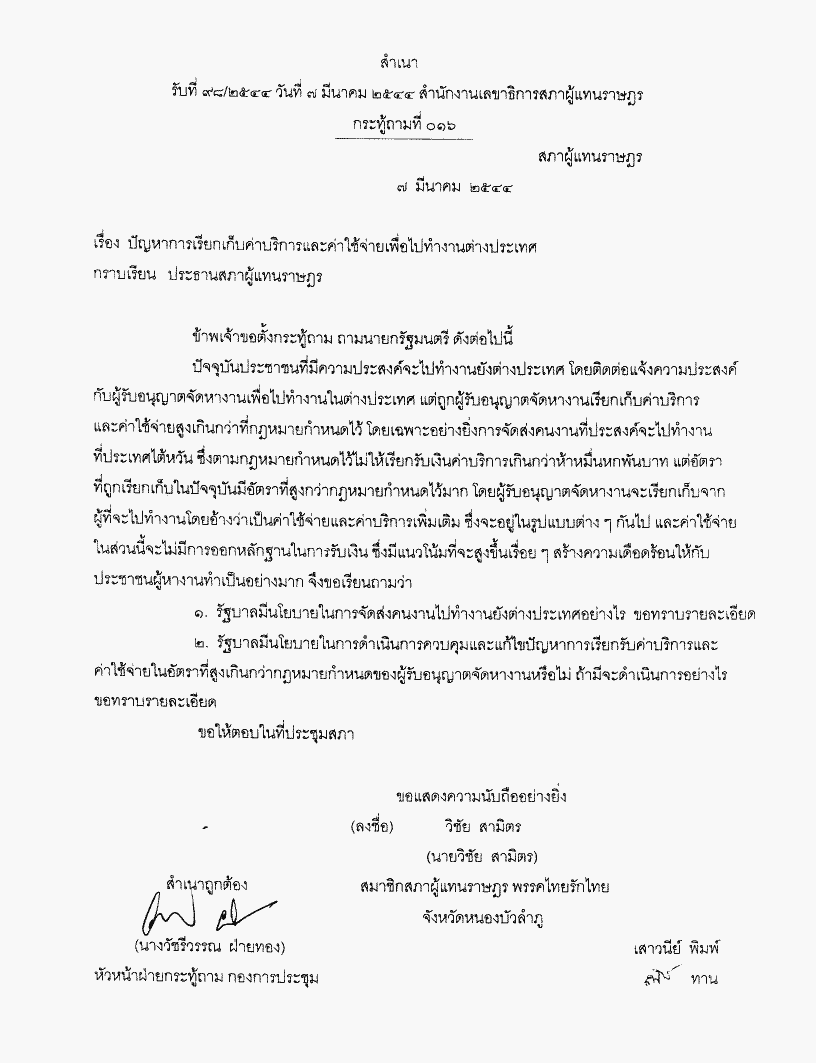 ๑.๒.๒ กระทู้ถาม เรื่อง ปัญหาการเรียกเก็บค่าบริการและค่าใช้จ่ายเพื่อไปทำงานต่างประเทศ นายสามิต เป็นผู้ตั้งกระทู้ถาม ถามนายกรัฐมนตรี |