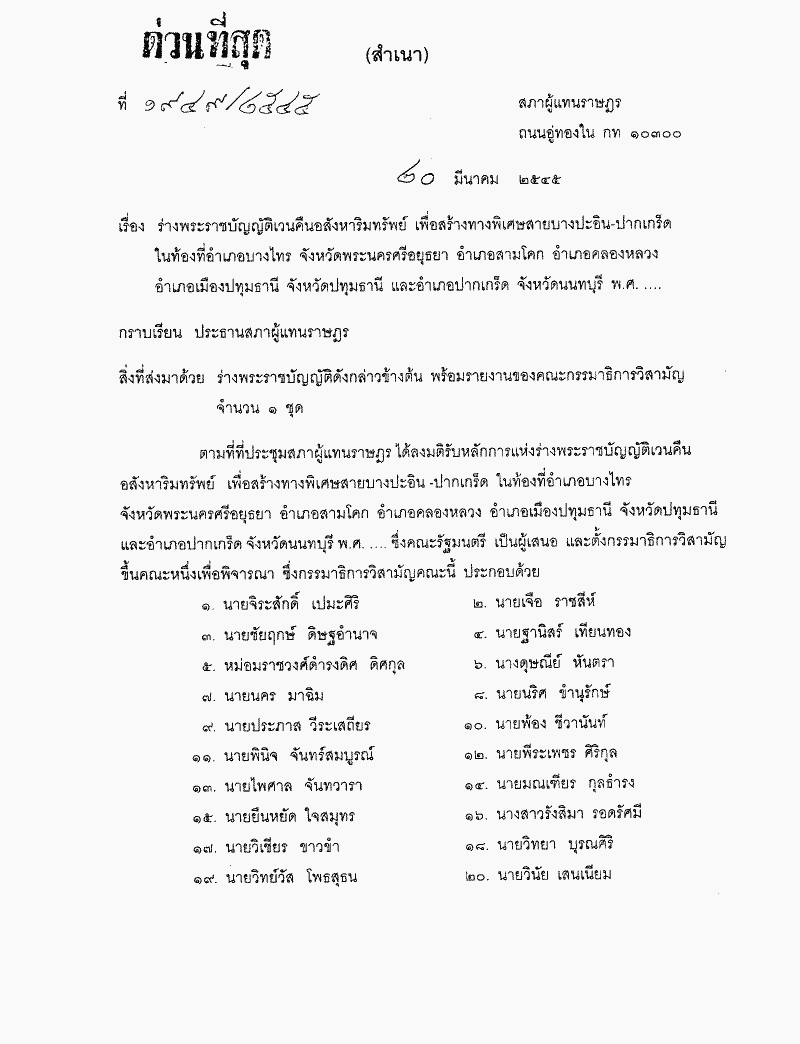 • ร่างพระราชบัญญัติเวนคืนอสังหาริมทรัพย์ เพื่อสร้างทางพิเศษสายบางปะอิน- ปากเกร็ดในท้องที่อำเภอบางไทร จังหวัดพระนครศรีอยุธยา อำเภอสามโคก อำเภอคลองหลวงอำเภอเมืองปทุมธานี จังหวัดปทุมธานี และอำเภอปากเกร็ด จังหวัดนนทบุรี พ.ศ. ......