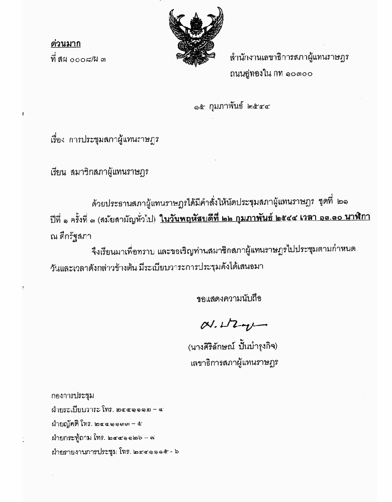 • ระเบียบวาระการประชุมสภาผู้แทนราษฎร ชุดที่ ๒๑ ปีที่ ๑ ครั้งที่ ๓ (สมัยสามัญทั่วไป) วันพฤหัสบดีที่ ๒๒ กุมภาพันธ์ ๒๕๔๔