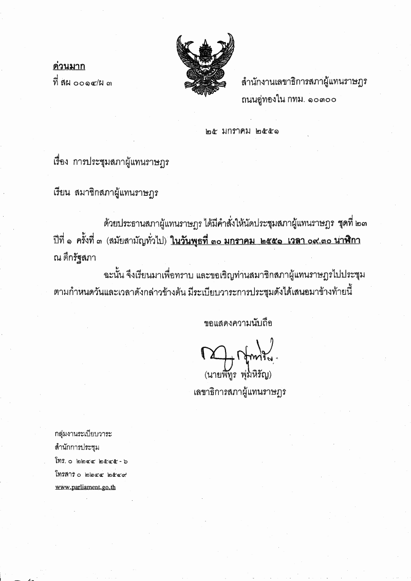 • ระเบียบวาระการประชุมสภาผู้แทนราษฎร ชุดที่ 23 ปีที่ 1 ครั้งที่ 3 (สมัยสามัญทั่วไป) ในวันพุธที่ 30 มกราคม 2551 เวลา 09.30 น.