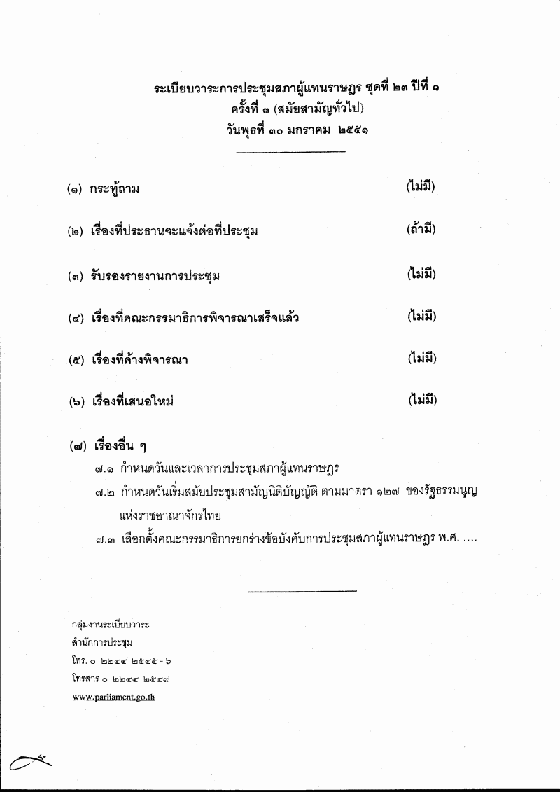 ชื่อเอกสาร : ระเบียบวาระการประชุมสภาผู้แทนราษฎร ชุดที่ 23 ปีที่ 1 ครั้งที่ 3 (สมัยสามัญทั่วไป) ในวันพุธที่ 30 มกราคม 2551 เวลา 09.30 น.