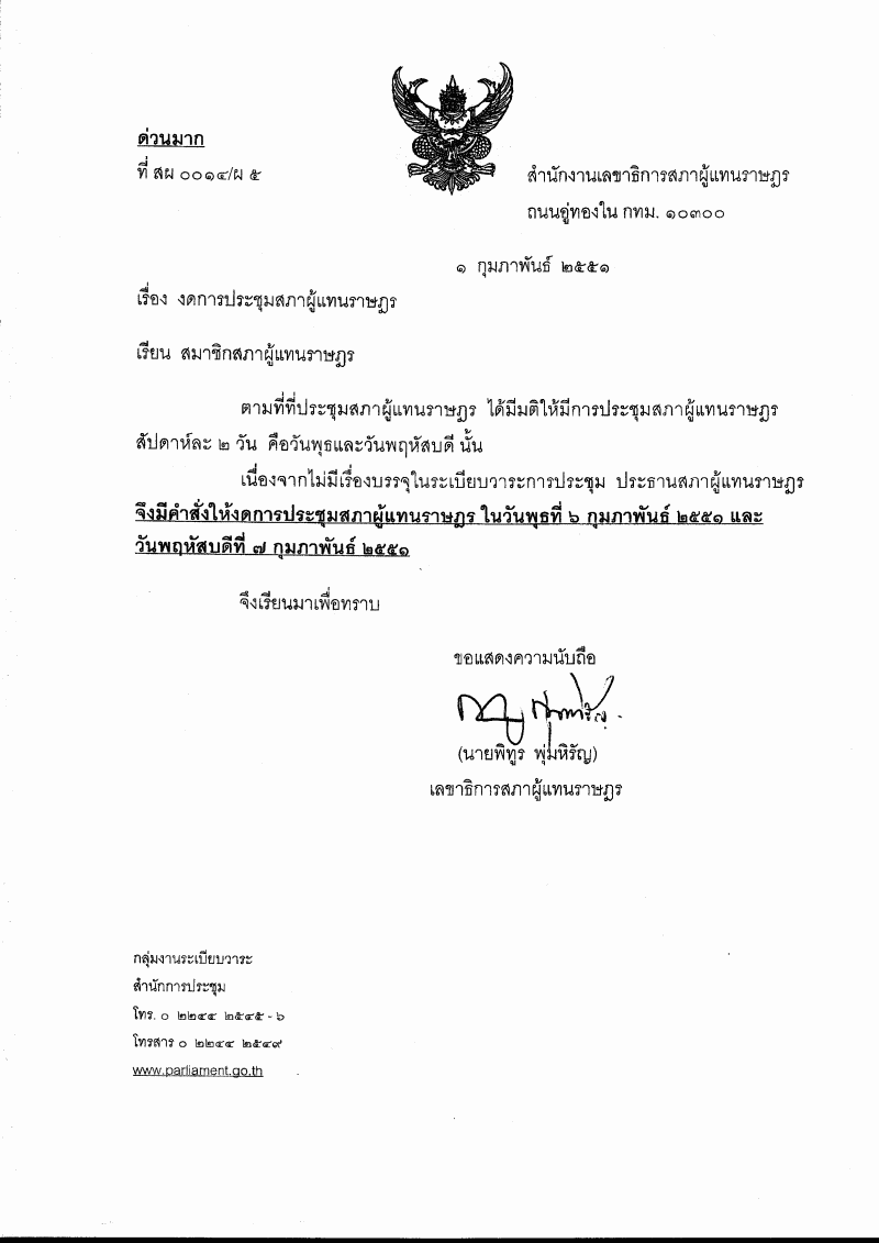 ชื่อเอกสาร : งดการประชุมสภาผู้แทนราษฎร วันพุธที่ ๖ กุมภาพันธ์ ๒๕๕๑ และวันพฤหัสบดีที่ ๗ กุมภาพันธ์ ๒๕๕๑