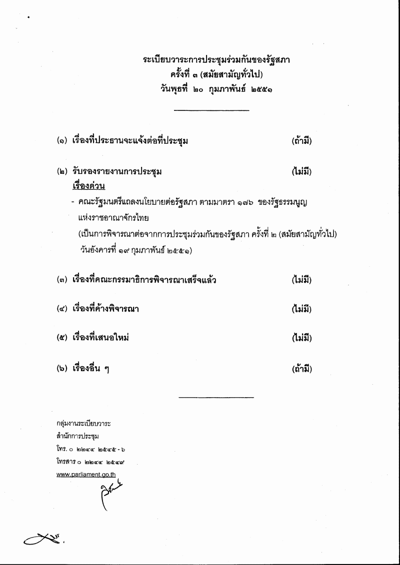 • ระเบียบวาระการประชุมร่วมกันของรัฐสภา ครั้งที่ ๓ (สมัยสามัญทั่วไป) วันพุธที่ ๒๐ กุมภาพันธ์ ๒๕๕๑ เวลา ๑๐.๓๐ นาฬิกา