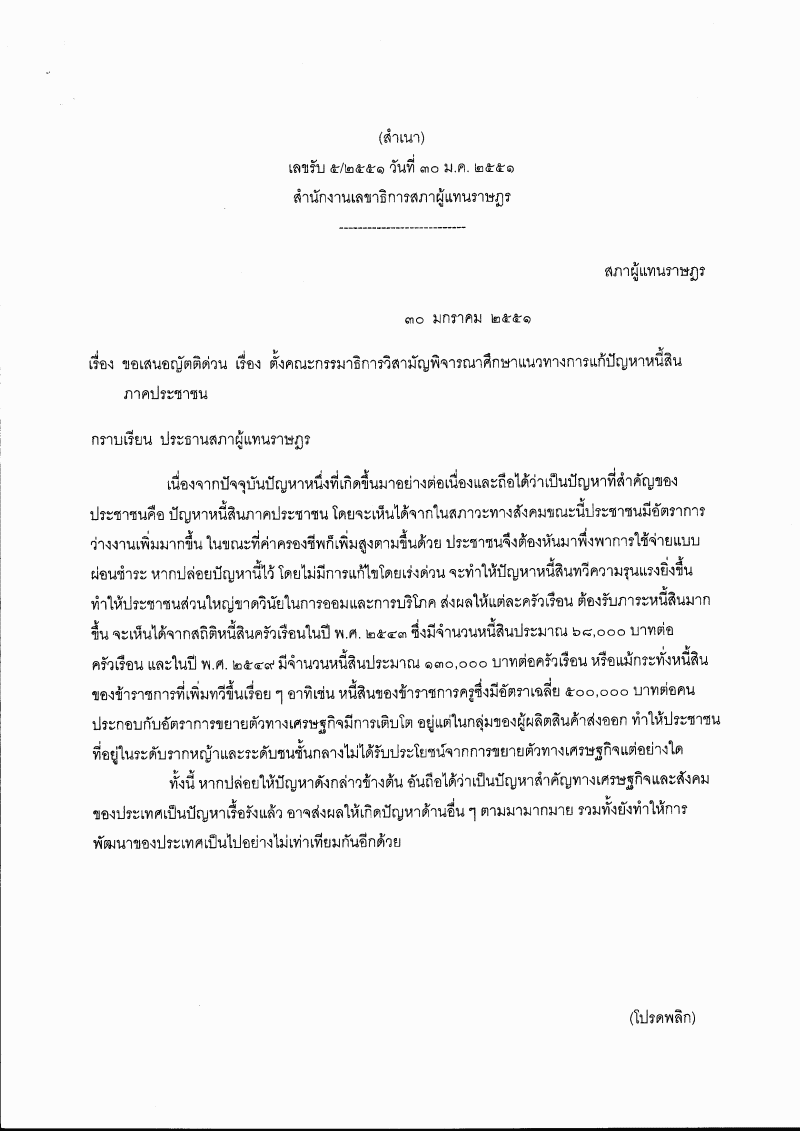 ชื่อเอกสาร :   ญัตติเรื่อง ตั้งคณะกรรมาธิการวิสามัญพิจารณาศึกษาแนวทางแก้ปัญหาหนี้สินภาคประะชาชน (นายจุติ ไกรฤกษ์ กับคณะ เป็นผู้เสนอ)