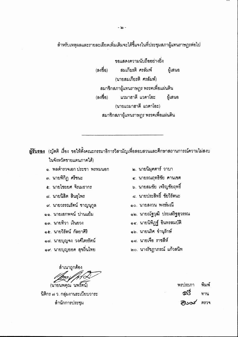 ญัตติ เรื่อง ขอให้ตั้งคณะกรรมาธิการวิสามัญเพื่อสอบสวนและศึกษาสถานการณ์ความไม่สงบในจังหวัดชายแดนภาคใต้ (นายสมเกียรติ ศรลัมพ์ และนายแวมาฮาดี แวดาโอะ เป็นผู้เสนอ) |