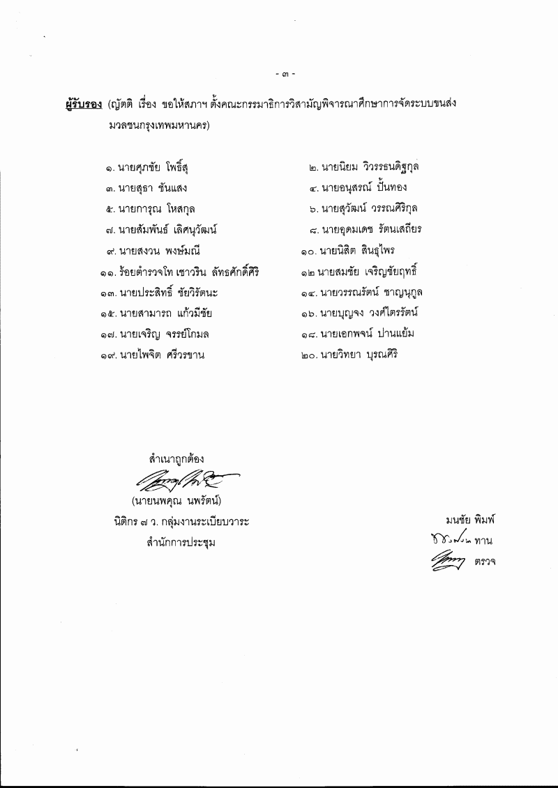 ชื่อเอกสาร :   ญัตติ เรื่อง ขอให้สภาฯ ตั้งคณะกรรมาธิการวิสามัญพิจารณาศึกษาการจัดระบบขนส่งมวลชนกรุงเทพมหานคร (นายวิชาญ มีนชัยนันท์ กับคณะ เป็นผู้เสนอ)