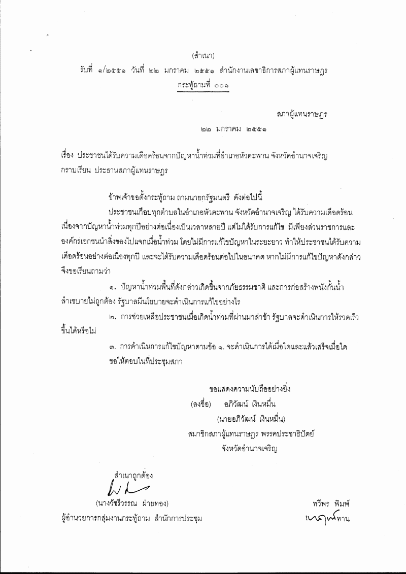 กระท้ถาม ที่ ๐๐๑ เรื่อง ประชาชนได้รับความเดือดร้อนจากปัญหาน้ำท่วม ที่อำเภอหัวตะพาน จังหวัดอำนาจเจริญ นายอภิวัฒน์ เงินหมื่น เป็นผู้ตั้งกระท้ถาม ถามนายกรัฐมนตรี |