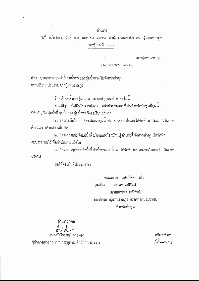 กระท้ถาม ที่ ๐๐๓ เรื่อง บูรณาการ ลุ่มน้ำลี้ ลุ่มน้ำทา และลุ่มน้ำกวง ในจังหวัดลำพูน นายสถาพร มณีรัตน์ เป็นผู้ตั้งกระทู้ถาม ถามนายกรัฐมนตรี |
