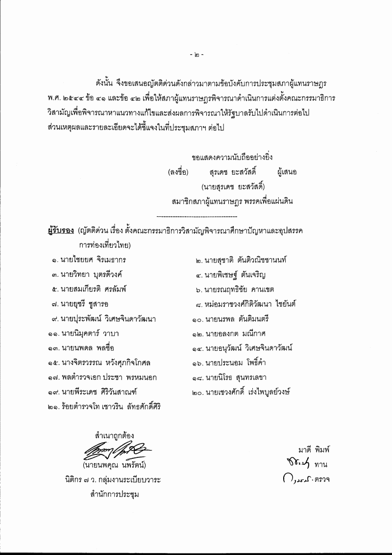 ญัตติด่วน เรื่อง ตั้งคณะกรรมาธิการวิสามัญพิจารณาศึกษาปัญหาและอุปสรรคการท่องเที่ยวไทย (นายสุรเดช ยะสวัสดิ์ เป็นผู้เสนอ) |