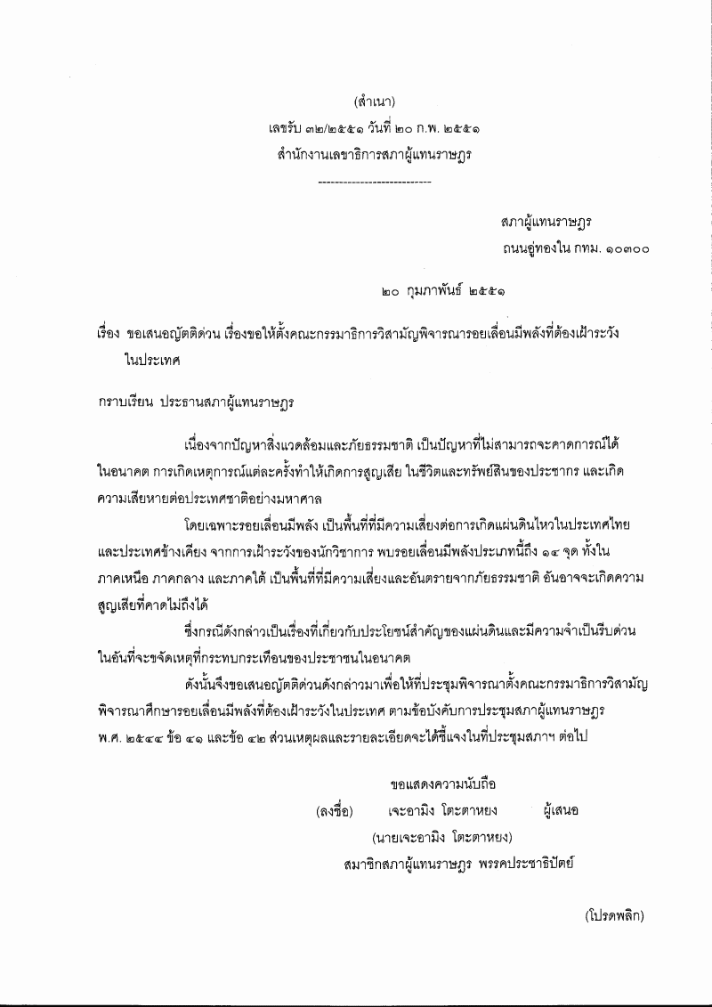 ชื่อเอกสาร :   ญัตติด่วน เรื่อง ขอให้ตั้งคณะกรรมาธิการวิสามัญพิจารณารอยเลื่อนมีพลังที่ต้องเฝ้าระวังในประเทศ (นายเจะอามิง โตะตาหยง กับคณะ เป็นผู้เสนอ)
