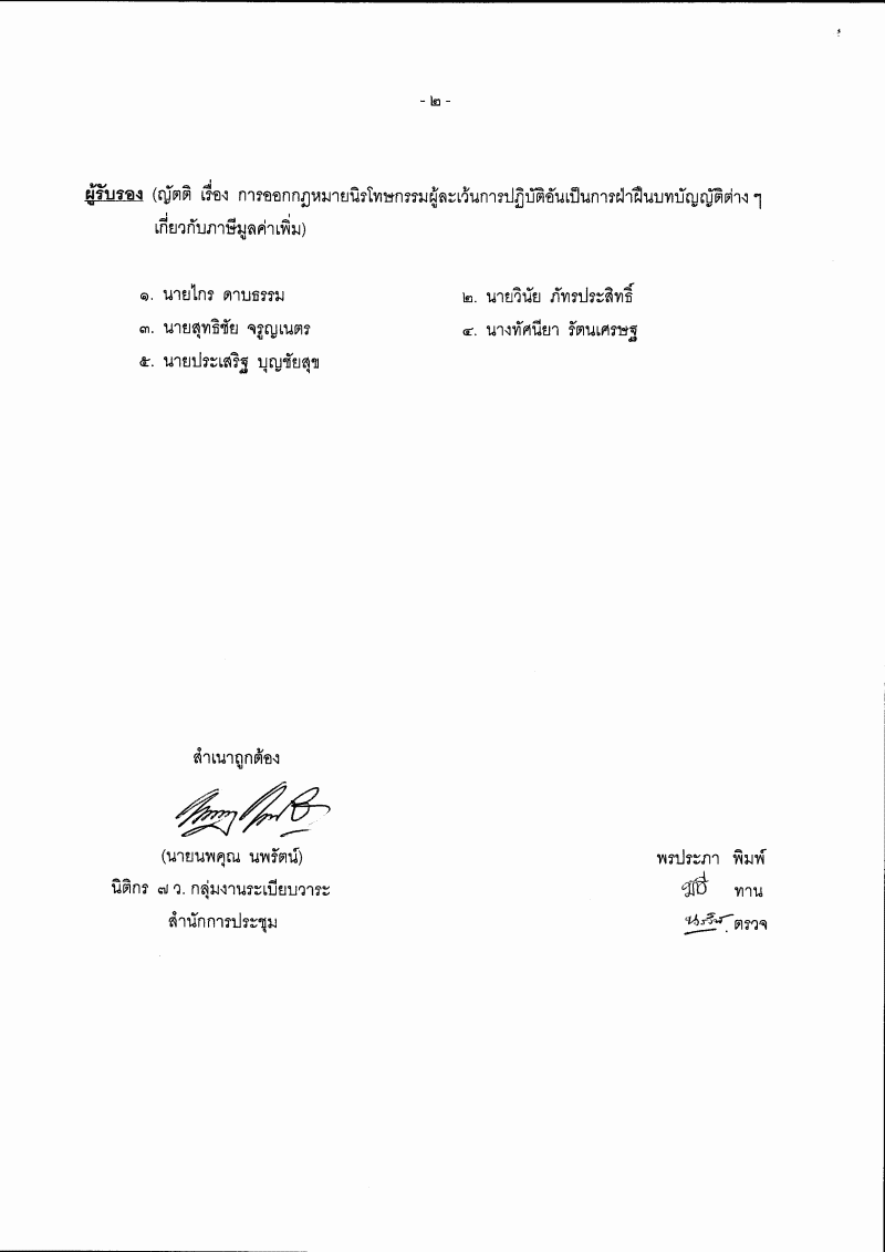 • ญัตติ เรื่อง การออกกฎหมายนิรโทษกรรมผู้ละเว้นการปฏิบัติอันเป็นการฝ่าฝืนบทบัญญัติต่าง ๆ เกี่ยวกับภาษีมูลค่าเพิ่ม (นางวรศุลี สุวรรรณปริสุทธิ์ เป็นผู้เสนอ)
