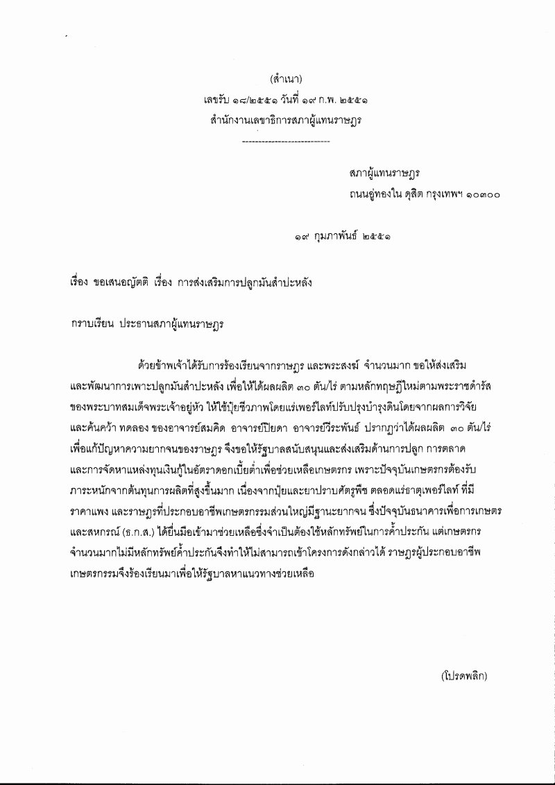 ญัตติ เรื่อง การส่งเสริมการปลูกมันสำปะหลัง (นายนิยม วรปัญญา และนายวิเชียร ขาวขำ เป็นผู้เสนอ) |