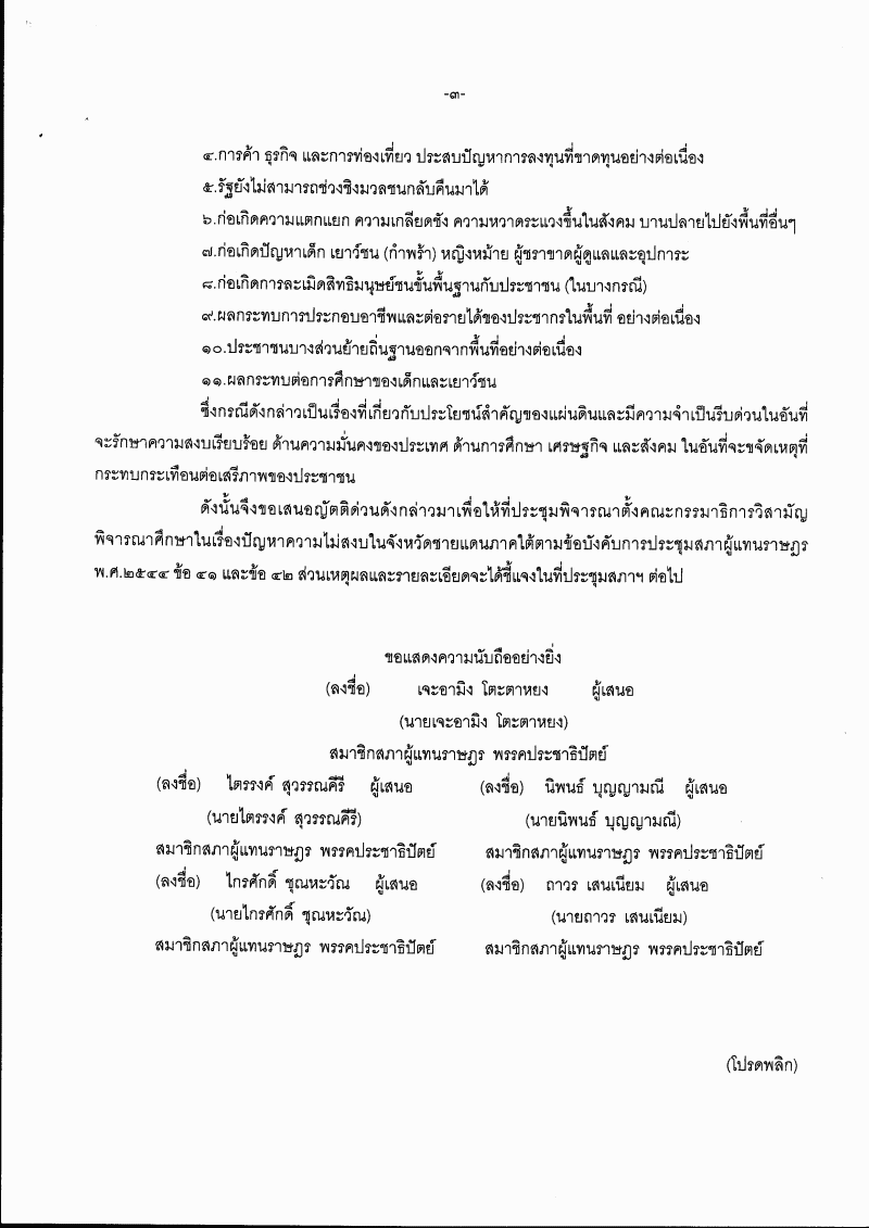 • ญัตติ เรื่อง ขอให้ตั้งคณะกรรมาธิการวิสามัญพิจารณาปัญหาความไม่สงบในจังหวัดชายแดนภาคใต้ (นายเจะอามิง โตะตาหยง กับคณะ เป็นผู้เสนอ)