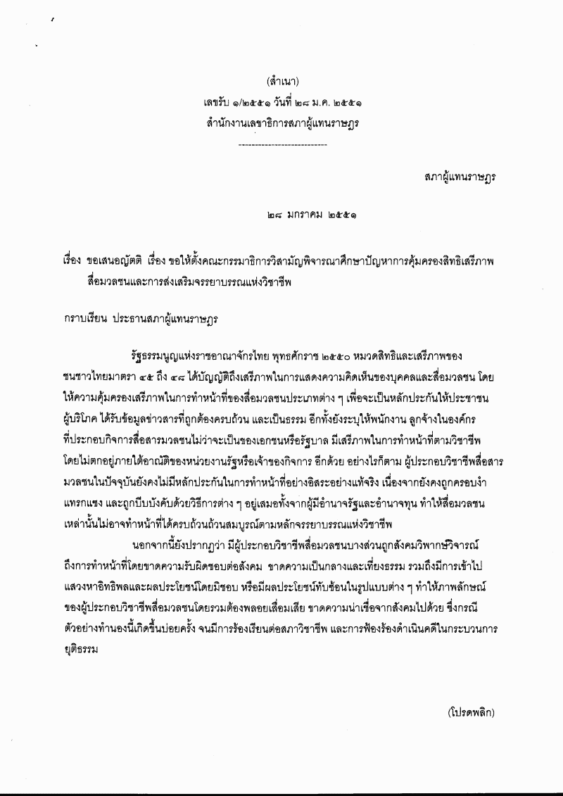 ญัตติ เรื่อง ขอให้ตั้งคณะกรรมาธิการวิสามัญพิจารณาศึกษาปัญหาการคุ้มครองสิทธิเสรีภาพสื่อมวลชนและการส่งเสริมจรรยาบรรณแห่งวิชาชีพ (นายอภิชาต ศักดิเศรษฐ์ กับคณะ เป็นผู้เสนอ) |