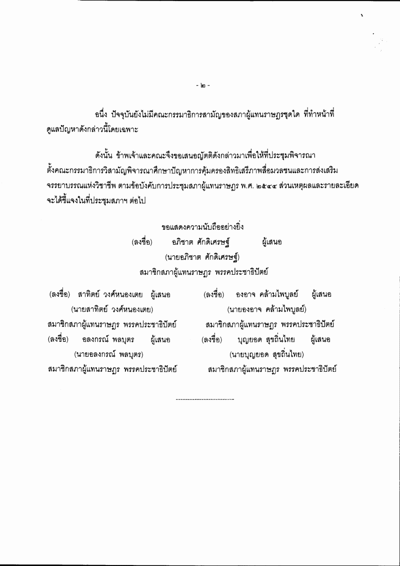 • ญัตติ เรื่อง ขอให้ตั้งคณะกรรมาธิการวิสามัญพิจารณาศึกษาปัญหาการคุ้มครองสิทธิเสรีภาพสื่อมวลชนและการส่งเสริมจรรยาบรรณแห่งวิชาชีพ (นายอภิชาต ศักดิเศรษฐ์ กับคณะ เป็นผู้เสนอ)