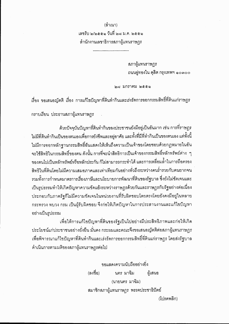 ญัตติ เรื่อง การแก้ไขปัญหาที่ดินทำกินและเร่งรัดการออกกรรมสิทธิ์ที่ดินแก่ราษฎร (นายนคร มาฉิม กับคณะ เป็นผู้เสนอ) |