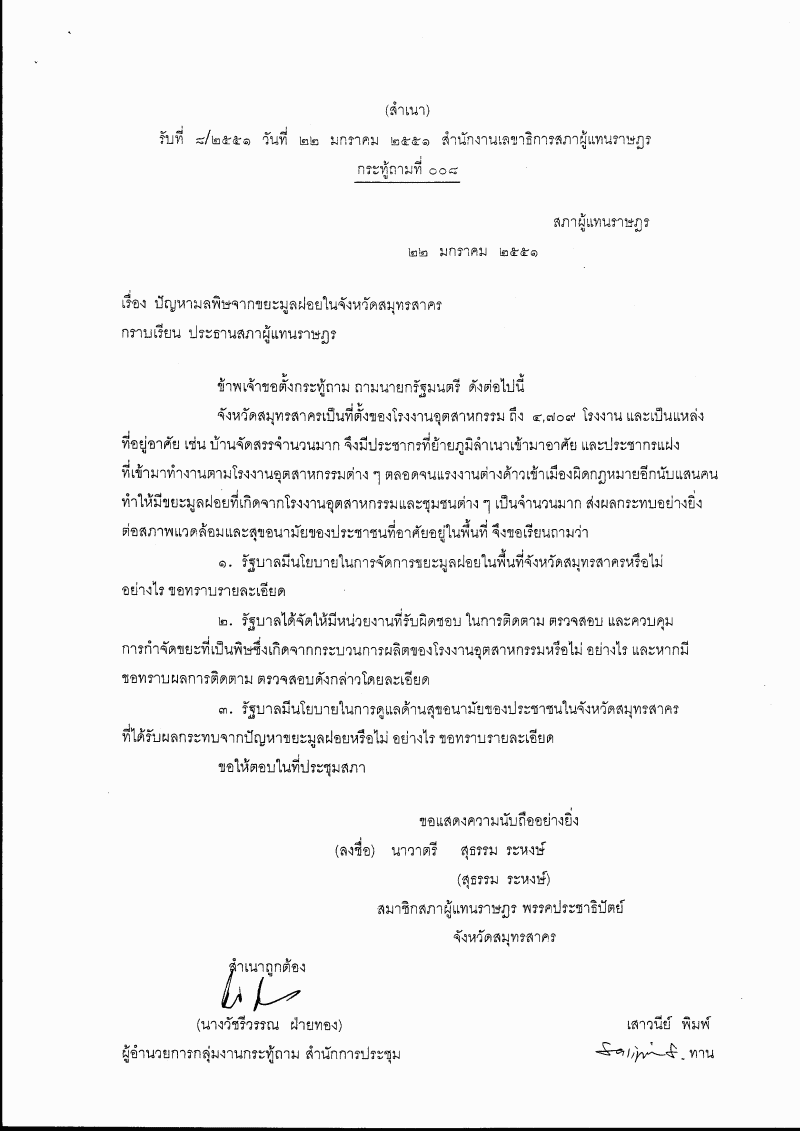 กระทู้ถาม ที่ ๐๐๘ เรื่อง ปัญหามลพิษจากขยะมูลฝอยในจังหวัดสมุทรสาคร นาวาตรี สุธรรม ระหงษ์ เป็นผู้ตั้งกระทู้ถาม |