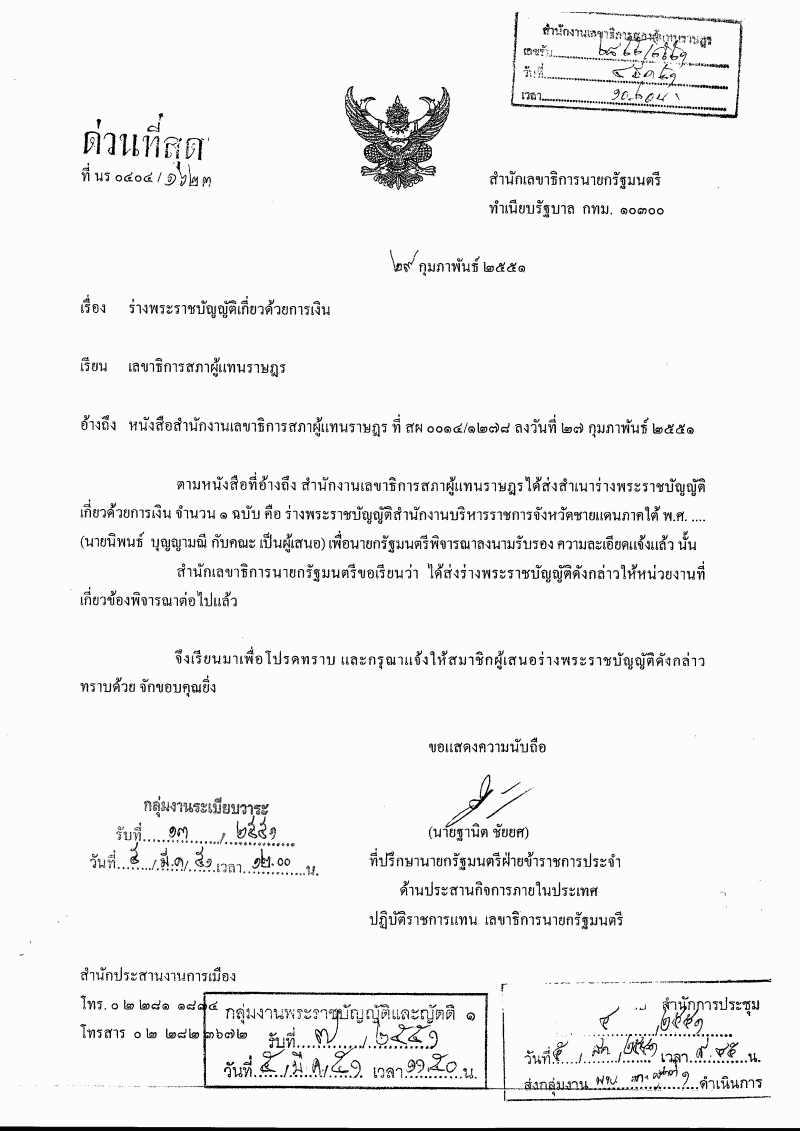 ชื่อเอกสาร :   รับทราบเรื่องนายกรัฐมนตรีได้รับร่างพระราชบัญญัติเกี่ยวด้วยการเงิน