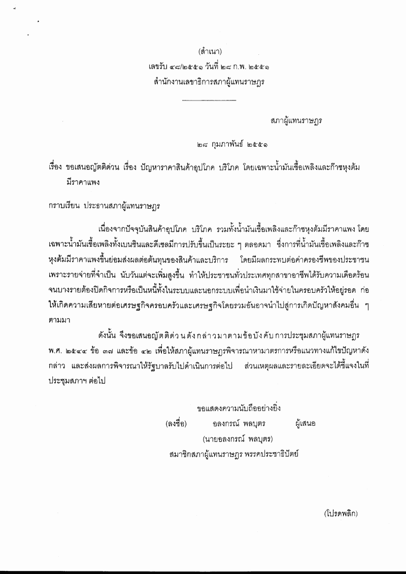 ญัตติด่วน เรื่อง ปัญหาราคาสินค้าอุปโภค บริโภค โดยเฉพาะน้ำมันเชื้อเพลิงและก๊าซหุงต้มมีราคาแพง (นายอลงกรณ์ พลบุตร กับคณะ เป็นผู้เสนอ) |