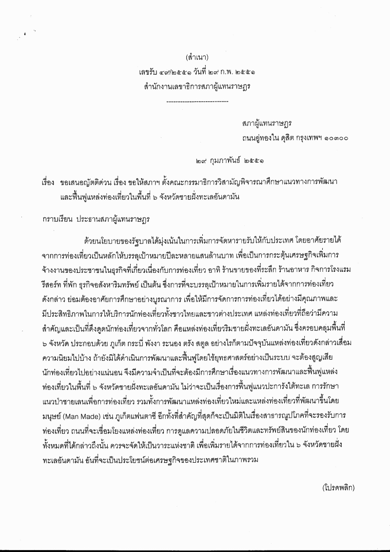 ชื่อเอกสาร :   ญัตติด่วน เรื่อง ขอให้สภาฯ ตั้งคณะกรรมาธิการวิสามัญพิจารณาศึกษาแนวทางการพัฒนาและฟื้นฟูแหล่งท่องเที่ยวในพื้นที่ ๖ จังหวัดชายฝั่งทะเลอันดามัน (นางสาวเฉลิมลักษณ์ เก็บทรัพย์ กับคณะ เป็นผู้เสนอ)