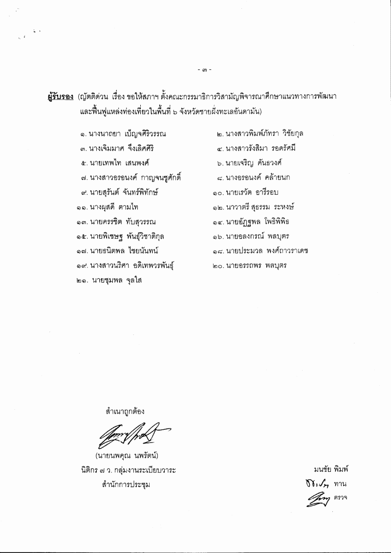 • ญัตติด่วน เรื่อง ขอให้สภาฯ ตั้งคณะกรรมาธิการวิสามัญพิจารณาศึกษาแนวทางการพัฒนาและฟื้นฟูแหล่งท่องเที่ยวในพื้นที่ ๖ จังหวัดชายฝั่งทะเลอันดามัน (นางสาวเฉลิมลักษณ์ เก็บทรัพย์ กับคณะ เป็นผู้เสนอ)