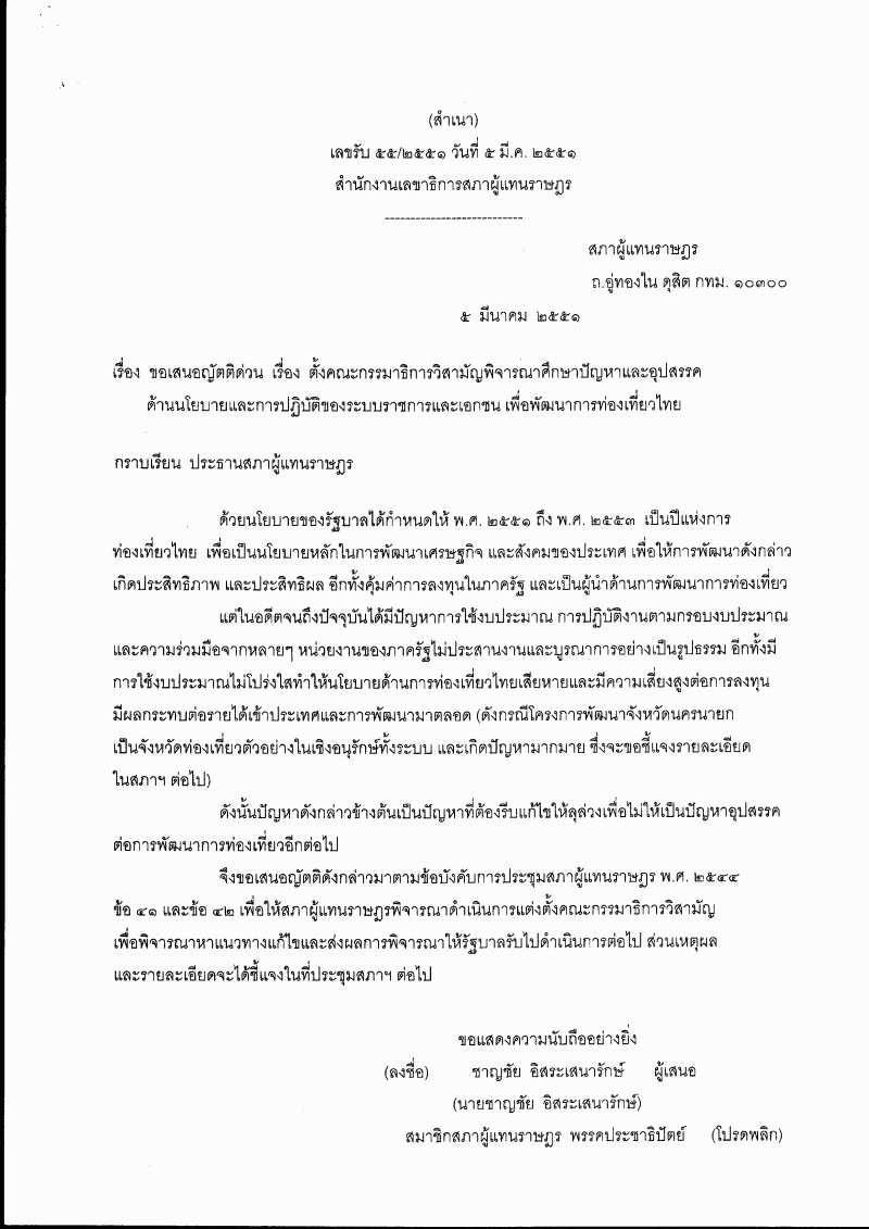 • ญัตติด่วน เรื่อง ขอให้สภาฯ ตั้งคณะกรรมาธิการวิสามัญพิจารณาศึกษาปัญหาและอุปสรรคด้านนโยบายและการปฏิบัติของระบบราชการและเอกชน เพื่อพัฒนาการท่องเที่ยวไทย (นายชาญชัย อิสระเสนารักษ์ เป็นผูเสนอ)