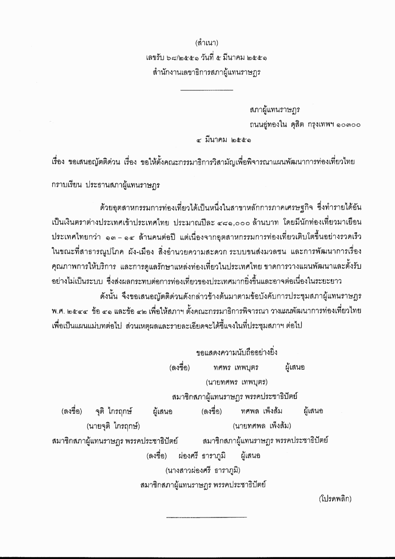 ญัตติด่วน เรื่อง ขอให้ตั้งคณะกรรมาธิการวิสามัญเพื่อพิจารณาแผนพัฒนาการท่องเที่ยวไทย (นายทศพร เทพบุตร กับคณะ เป็นผู้เสนอ) |