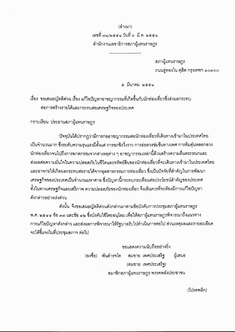 • ญัตติด่วน เรื่อง แก้ไขปัญหาอาชญากรรมที่เกิดขึ้นกับนักท่องเที่ยวซึ่งผลกระทบต่อการสร้างรายได้และกระทบต่อเศรษฐกิจของประเทศ (พันตำรวจโท สมชาย เพศประเสรฐิ เป็นผู้เสนอ)
