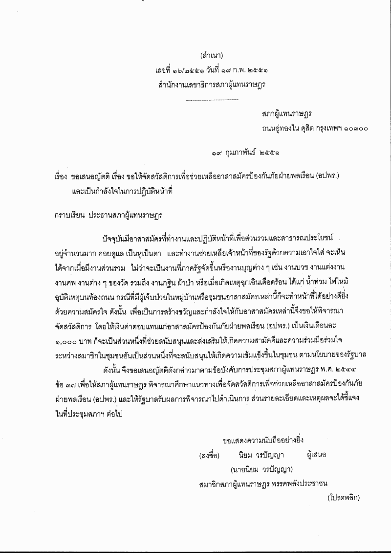 • ญัตติ เรื่อง ขอให้จัดสวัสดิการเพื่อช่วยเหลืออาสาสมัครป้องกันภัยฝ่ายพลเรือน (อปพร.) และเป็นกำลังใจในการปฏิบัติหน้าที่ (นายนิยม วรปัญญา กับคณะ เปฌนผู้เสนอ)