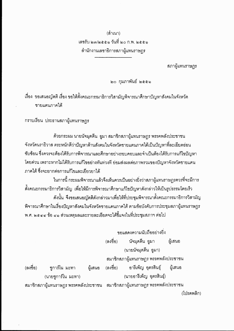 ญัตติ เรื่อง ขอให้ตั้งคณะกรรมาธิการวิสามัญพิจารณาศึกษาปัญหาสังคมในจังหวัดชายแดนภาคใต้ (นายนัจมุดดีน อูมา กับคณะ เป็นผู้เสนอ) |