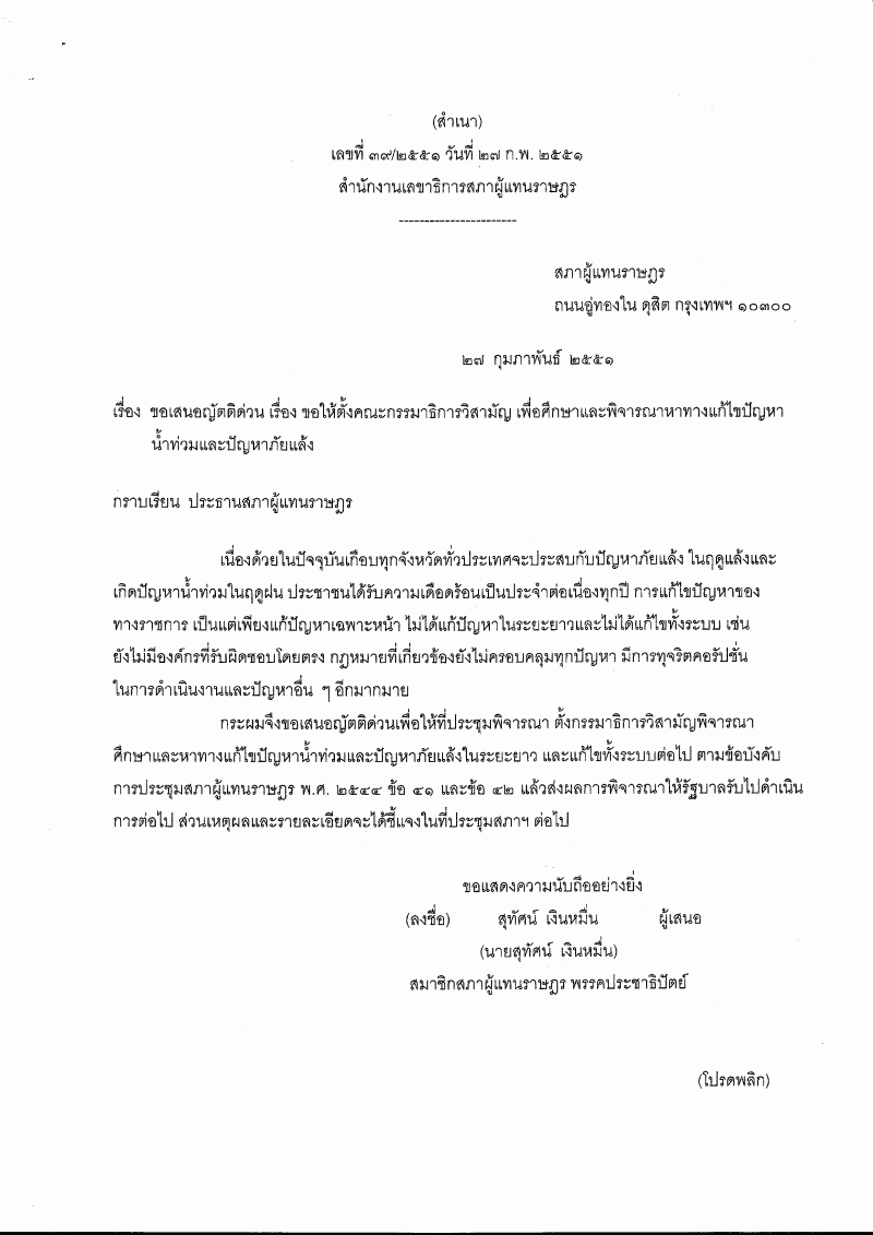 ญัตติ เรื่อง ขอให้ตั้งคณะกรรมาธิการวิสามัญ เพื่อศึกษาและพิจาณาหาทางแก้ไขปัญหาน้ำท่วมและปัญหาภัยแล้ง (นายสุทัศน์ เงินหมื่น กับคณะ เป็นผู้เสนอ) |