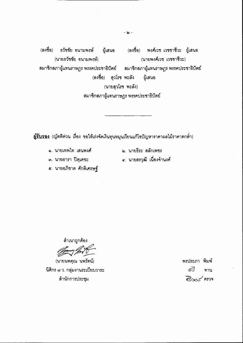 ญัตติ เรื่อง ขอให้เร่งจัดเงินทุนหมุนเวียนแก้ไขปัญหาราคาผลไม้ราคาตกต่ำ (นายยุคล ชนะวัฒน์ปัญญา กับคณะ เป็นผู้เสนอ) |