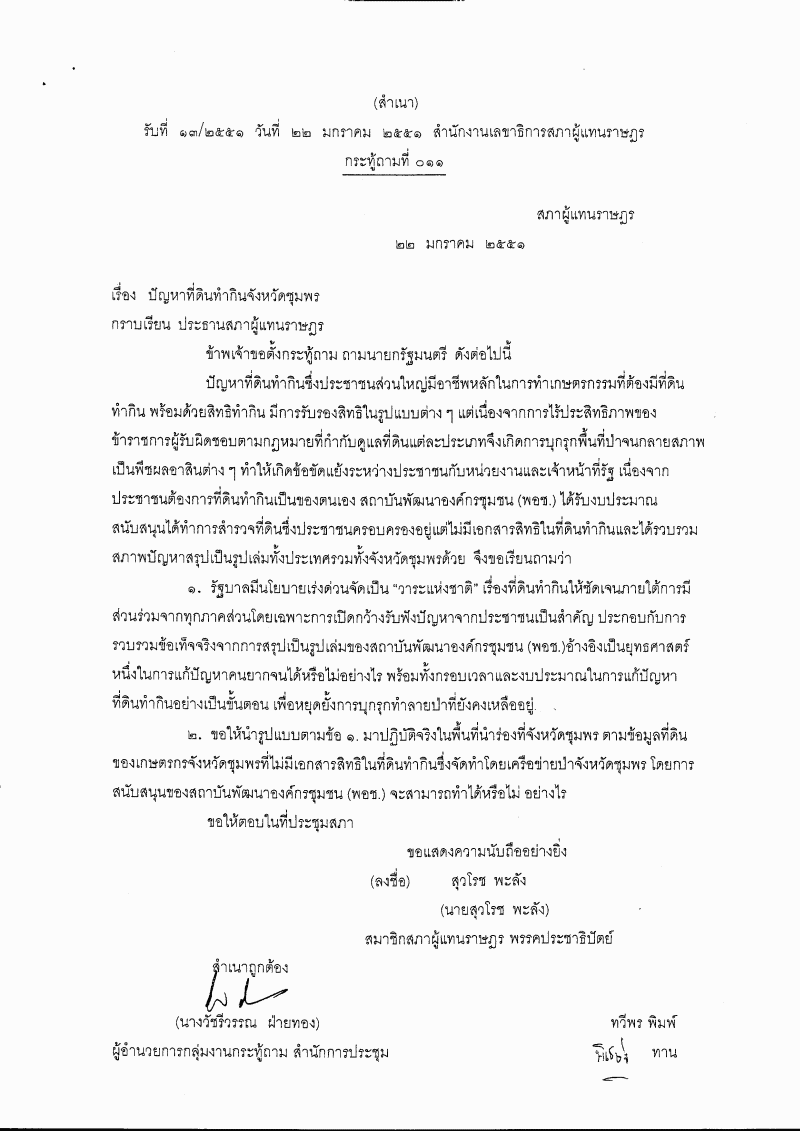 กระทู้ถาม ที่ ๐๑๑ เรื่อง ปัญหาที่ทำกินจังหวัดชุมพร นายสุวโรช พะลัง เป็นผู้ตั้งกระทู้ถาม ถาม นายกรัฐมนตรี |