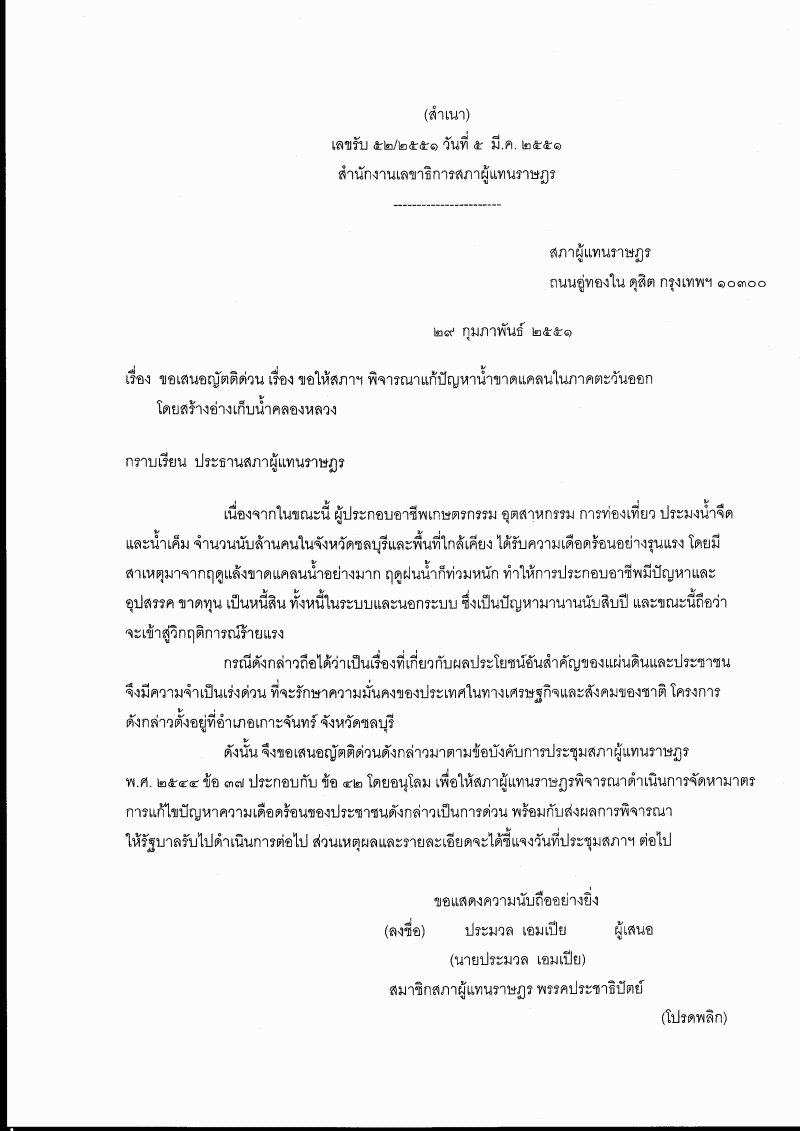 • ญัตติ เรื่อง ขอให้สภาฯ พิจารณาแก้ปัญหาน้ำขาดแคลนในภาคตะวันออกโดยสร้างอ่างเก็บน้ำคลองหลวง (นายประมวล เอมเปีย กับคณะ เป็นผู้เสนอ)