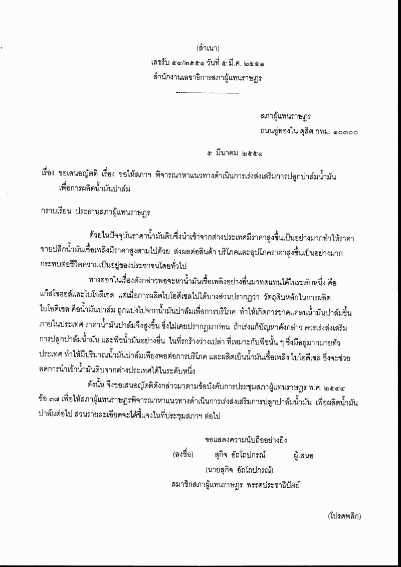 ชื่อเอกสาร :   ญัตติ เรื่อง ขอให้สภาฯ พิจารณาหาแนวทางดำเนินการเร่งส่งเสริมการปลูกปาล์มน้ำมันเพื่อการผลิตน้ำมันปาล์ม (นายสุกิจ อัถโถปกรณ์ กับคณะ เป็นผู้เสนอ)